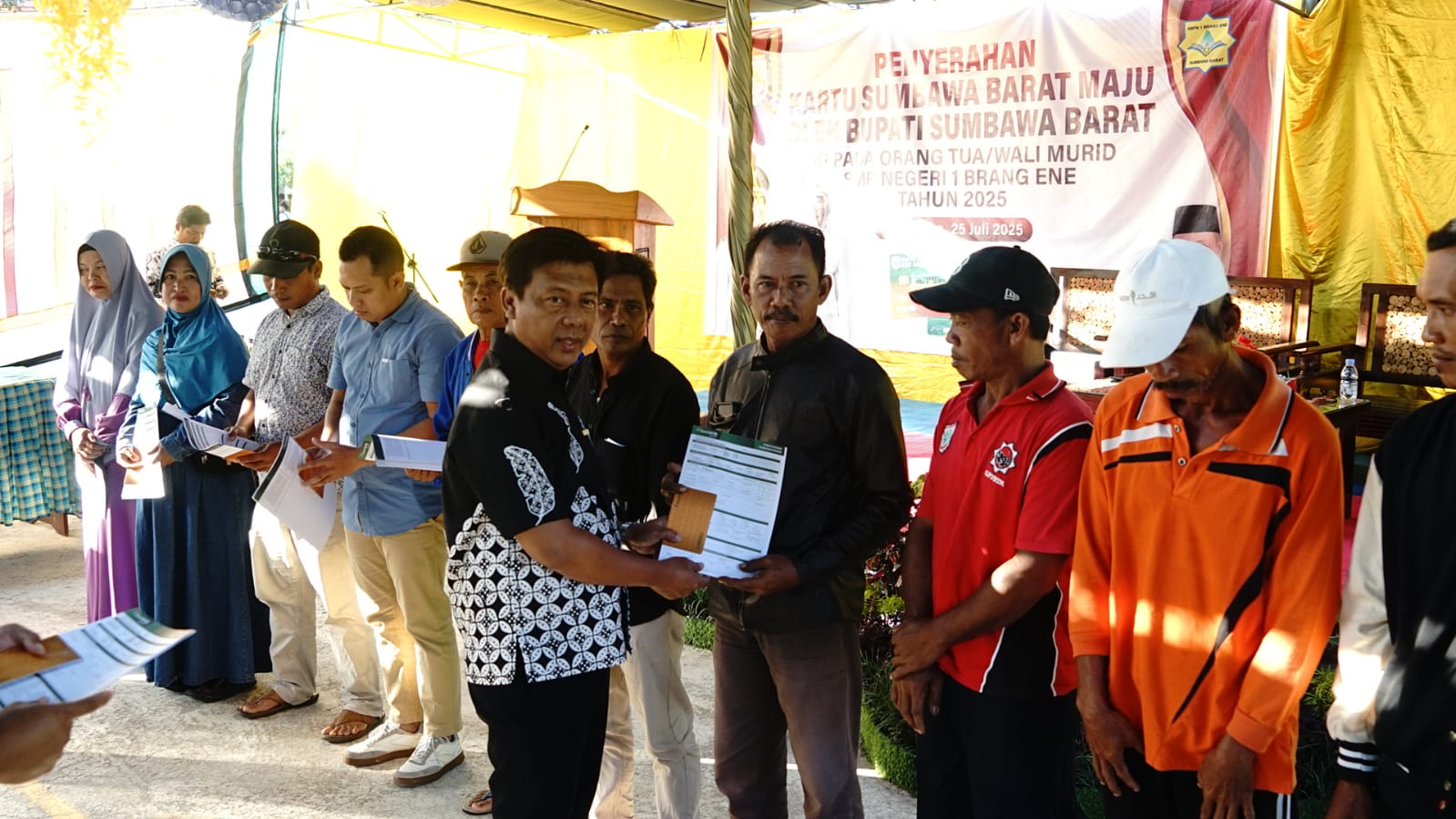 Sumbawa Barat - Roadshow hari keempat, Bupati Sumbawa Barat H. Amar Nurmansyah, S.T., M.Si. menyerahkan Kartu Sumbawa Barat Maju untuk layanan Maju Pendidikan kepada orang tua/wali murid SMP Negeri 1 Brang Ene pada Jumat (25/07/2025).